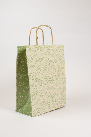 Tutte le buste montano un manico ritorto in carta, più resistente e comodo rispetto al cordoncino sottile: non taglia le dita, non si sfilaccia e sostiene il peso senza problemi. Un dettaglio che chi lavora nel retail nota subito.