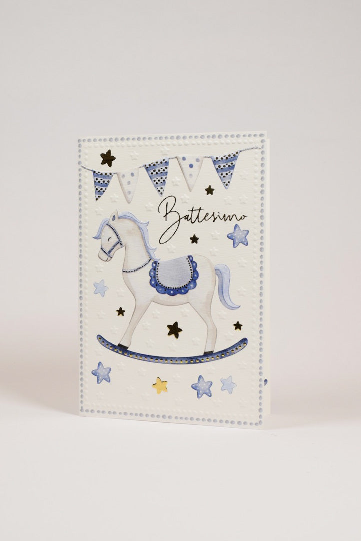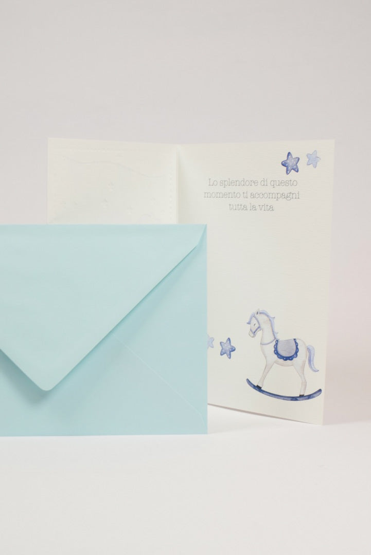Biglietto Battesimo Bimbo Cavallino Azzurro Glitter Busta - 1 pz