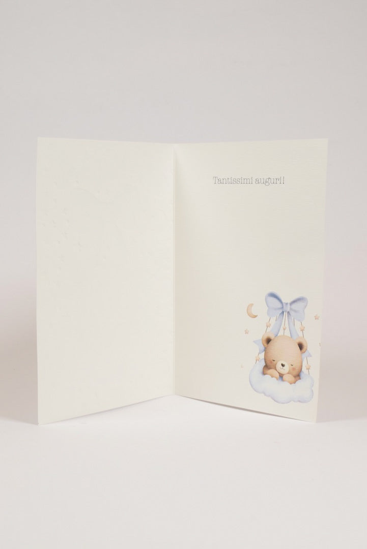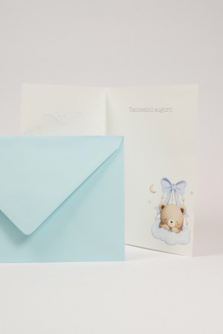 - Made in Italy da una storica azienda italiana specializzata in biglietti augurali di alta qualità.Illustrazione tenera e sognante con un dolcissimo orsetto beige che riposa sereno su una soffice nuvoletta celeste, sostenuto da un elegante fiocco azzurro in raso