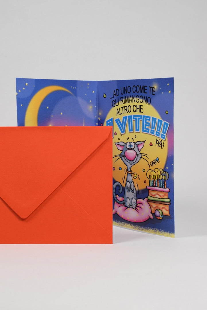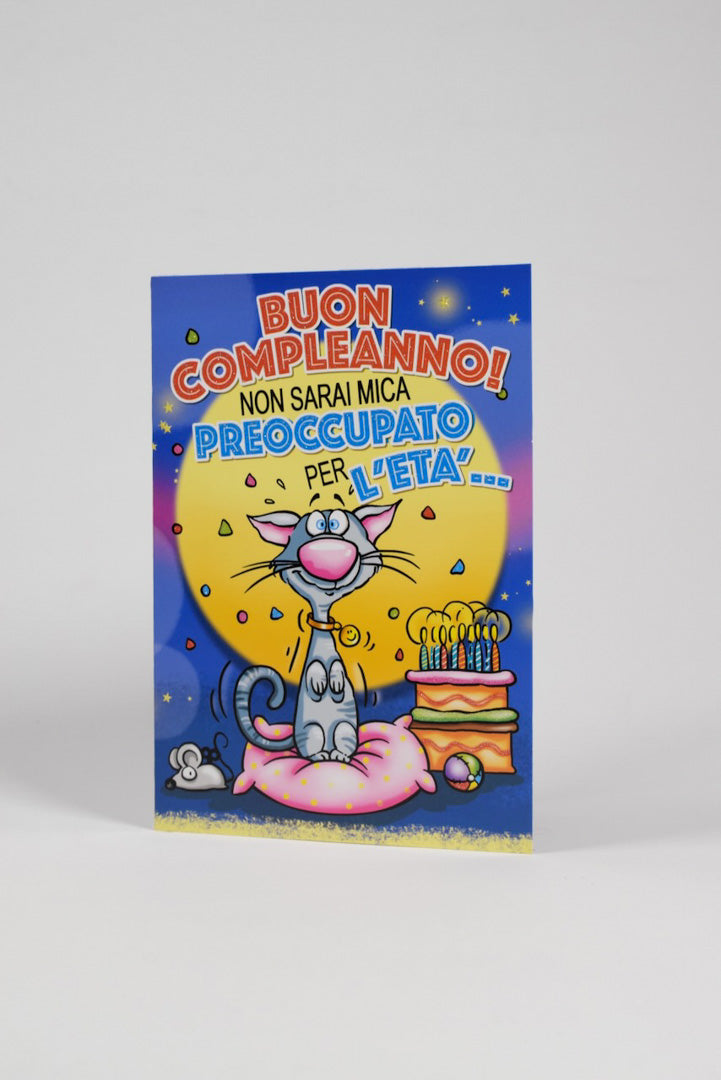 - Messaggio umoristico a doppia battuta: in copertina "Buon Compleanno! Non sarai mica preoccupato per l'età..." e all'interno la risposta esilarante "...Ad uno come te gli rimangono altro che 7 vite!!!"