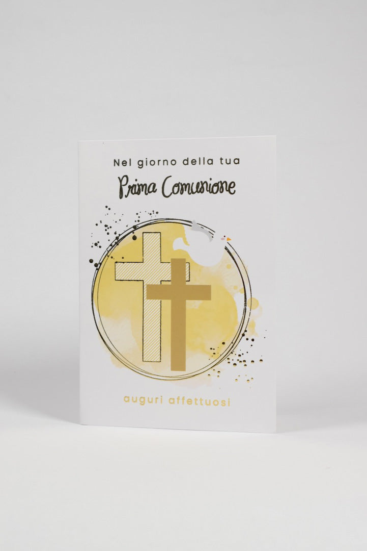 - Scritta "Nel giorno della tua Prima Comunione" in elegante lettering, accompagnata dalla dedica "auguri affettuosi" per un messaggio completo e caloroso