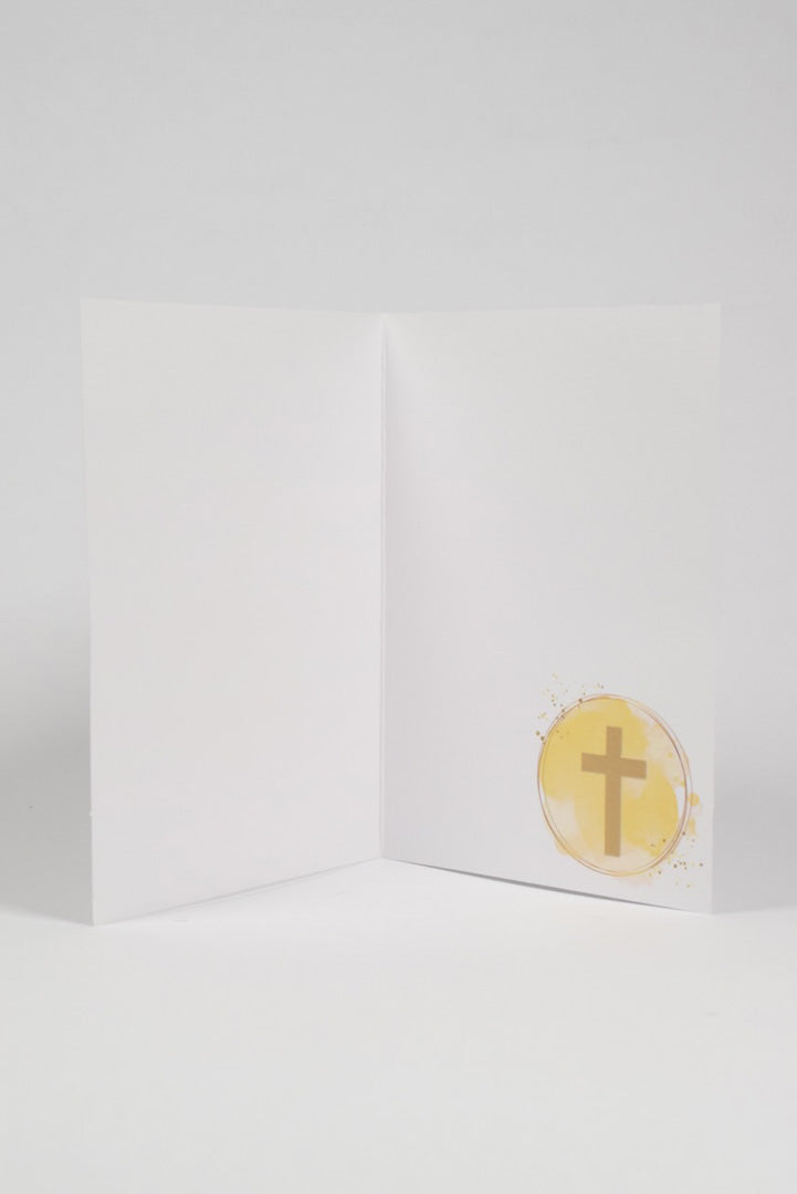 Un biglietto che celebra la fede con eleganza. Le due croci sovrapposte — una con finitura dorata piena, l'altra con delicato motivo a righe — creano un gioco visivo raffinato che cattura l'attenzione. Posizionate al centro di uno sfondo acquerello sui toni del giallo oro, trasmettono calore, luce e solennità, rendendo questo biglietto un degno accompagnamento per un sacramento così importante.