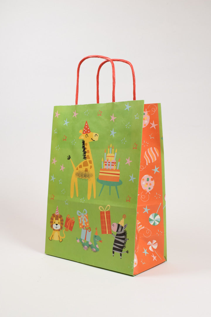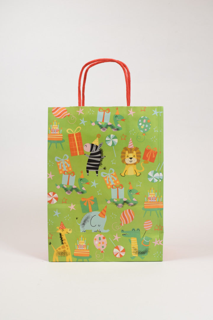Una festa della giungla tutta da scartare. La borsa Festa di Compleanno Animali trasforma ogni regalo in un invito alla festa più divertente della savana. L'illustrazione presenta una simpatica brigata di animali con cappellini colorati: una giraffa sorridente che saluta accanto a una torta a più piani con candeline accese, un leoncino seduto con il suo pacchetto regalo, una zebra che porta un grande dono e un piccolo coccodrillo con il suo cappellino a punta. Lo sfondo verde prato è punteggiato da stelle colorate, mentre pacchi regalo con fiocchi azzurri, rossi e arancioni completano l'atmosfera festosa. I manici rosso corallo e i lati in arancione vivace con palloncini e caramelle aggiungono ulteriore allegria.