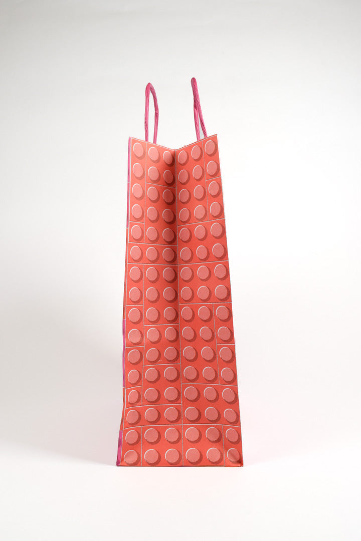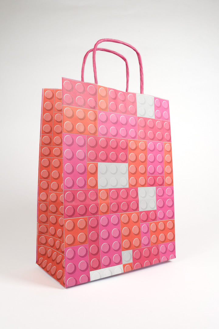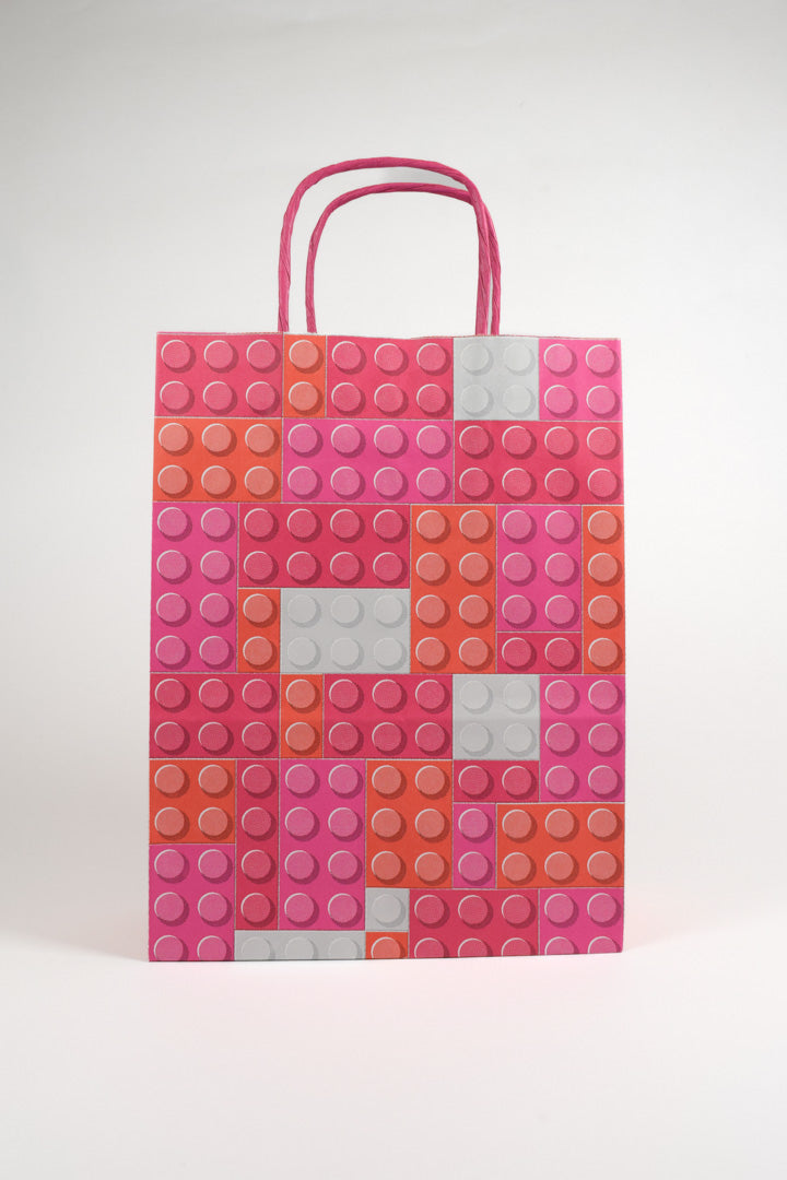 Il design a mattoncini di queste borse shopper conquista al primo sguardo grazie a una palette cromatica delicata e femminile che mixa sapientemente il rosa fucsia intenso, il corallo caldo e il rosa confetto. I blocchi colorati si alternano su tutta la superficie della borsa creando un mosaico tridimensionale che richiama l'universo delle costruzioni con un twist romantico e moderno, perfetto per chi cerca qualcosa di originale e distintivo. I manici in carta ritorta, realizzati in un vivace fucsia perfettamente abbinato al design, non solo completano esteticamente il prodotto ma garantiscono anche robustezza e praticità, essenziali per una shopper di queste dimensioni generose.