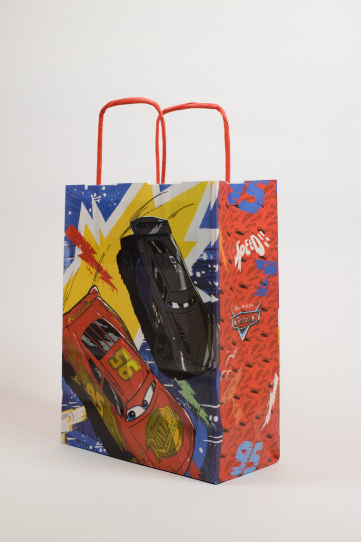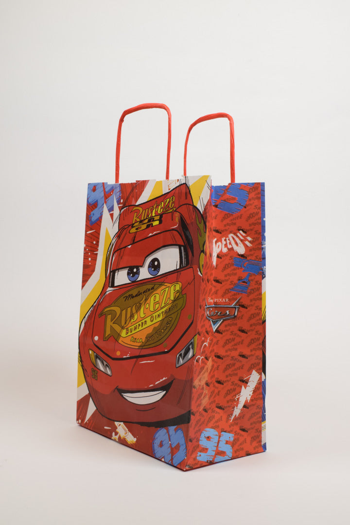 Velocità e adrenalina in ogni regalo. Queste borse regalo Disney Pixar Cars catapultano i bambini direttamente nel mondo delle corse automobilistiche più amate del grande schermo. La stampa roto offset professionale restituisce colori vivacissimi e saturi: il rosso fiammante della carrozzeria di Saetta McQueen, il nero lucido di Jackson Storm, i fulmini gialli esplosivi e il blu intenso dello sfondo. Ogni dettaglio è curato con precisione: dal logo Rust-eze sul cofano di Saetta al numero 95, dalle scritte "Speed" sui lati fino al logo ufficiale Disney Pixar Cars. Il risultato è un packaging dinamico e coinvolgente che fa battere il cuore a tutti i piccoli appassionati di motori.
