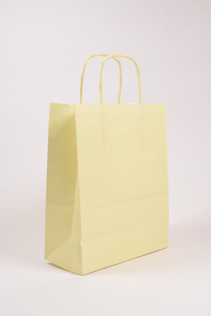 Caratteristiche del prodotto Le borse regalo Allegra in formato grande si distinguono per il delicato colore giallo crema che trasmette immediatamente luminosità, dolcezza e raffinatezza. Il design monocolore total look, con manici in carta ritorta perfettamente coordinati, crea un effetto armonioso e delicato. La carta kraft bianca di qualità e la stampa con colori all'acqua garantiscono un prodotto resistente, capiente e rispettoso dell'ambiente.