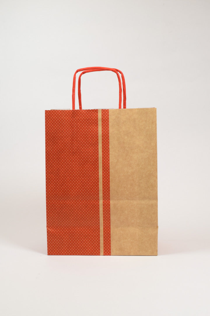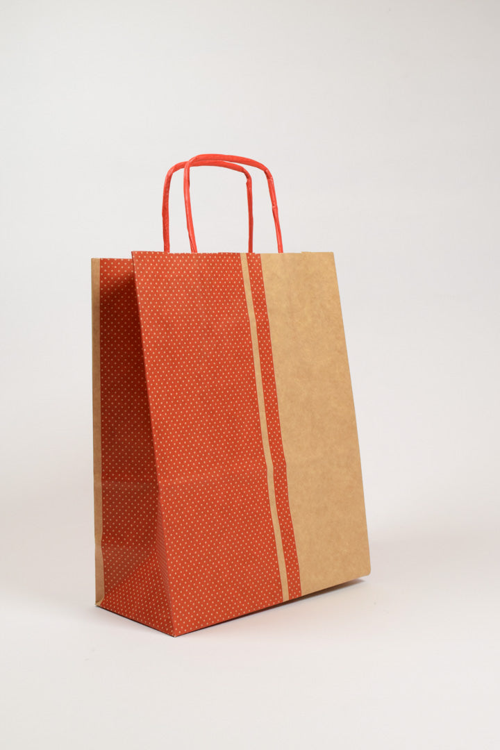 Caratteristiche del prodotto. Le Borse Allegra Tinta Unita millepunti kraft Rosso nel formato maxi 36x12x41 cm rappresentano la proposta più generosa della collezione, pensata per chi necessita di capienza senza rinunciare allo stile. Il design bicolore alterna la vivace fascia a pois bianchi su fondo rosso con una elegante sezione in kraft naturale, creando un effetto visivo moderno e sofisticato. La carta di grammatura elevata e i manici rinforzati garantiscono solidità anche con carichi importanti, mentre la stampa con colori all'acqua e l'interno kraft bianco testimoniano una cura artigianale in ogni dettaglio.