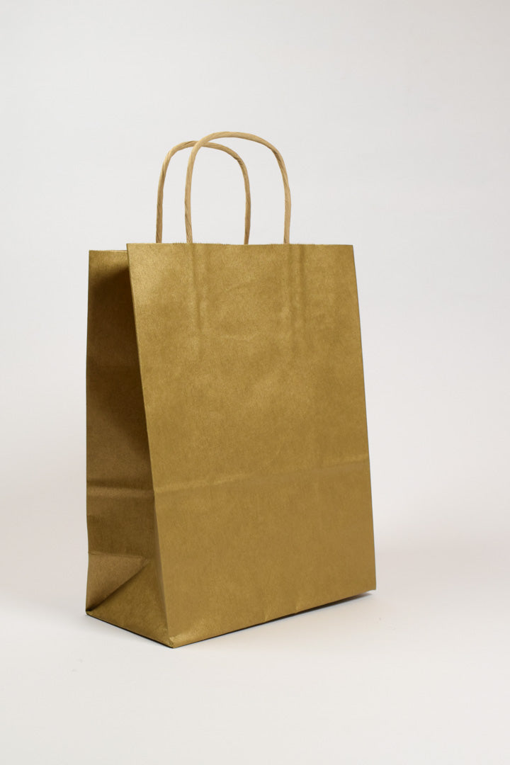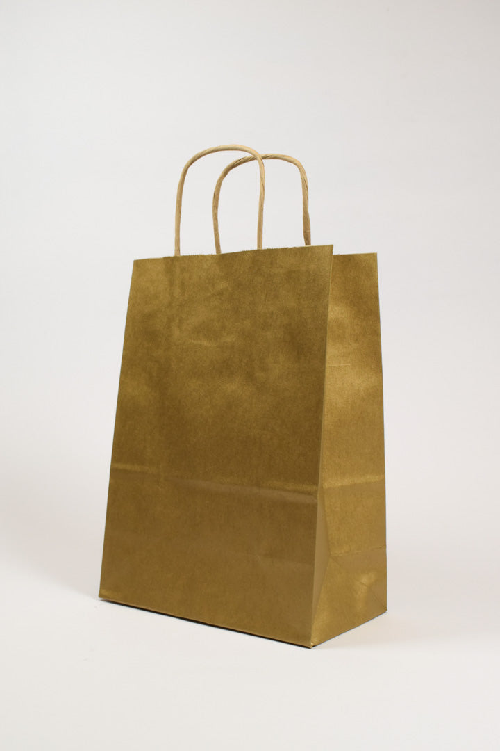 Caratteristiche del prodotto. Queste borse regalo della linea Allegra si distinguono per l'elegante finitura oro scuro che richiama le tonalità calde del bronzo antico, conferendo un aspetto lussuoso e ricercato. Il design monocolore essenziale e sofisticato permette di adattarsi a qualsiasi occasione, mentre i manici in carta ritorta coordinati completano l'insieme con un dettaglio di classe. La qualità della carta garantisce resistenza e un effetto visivo di grande impatto.