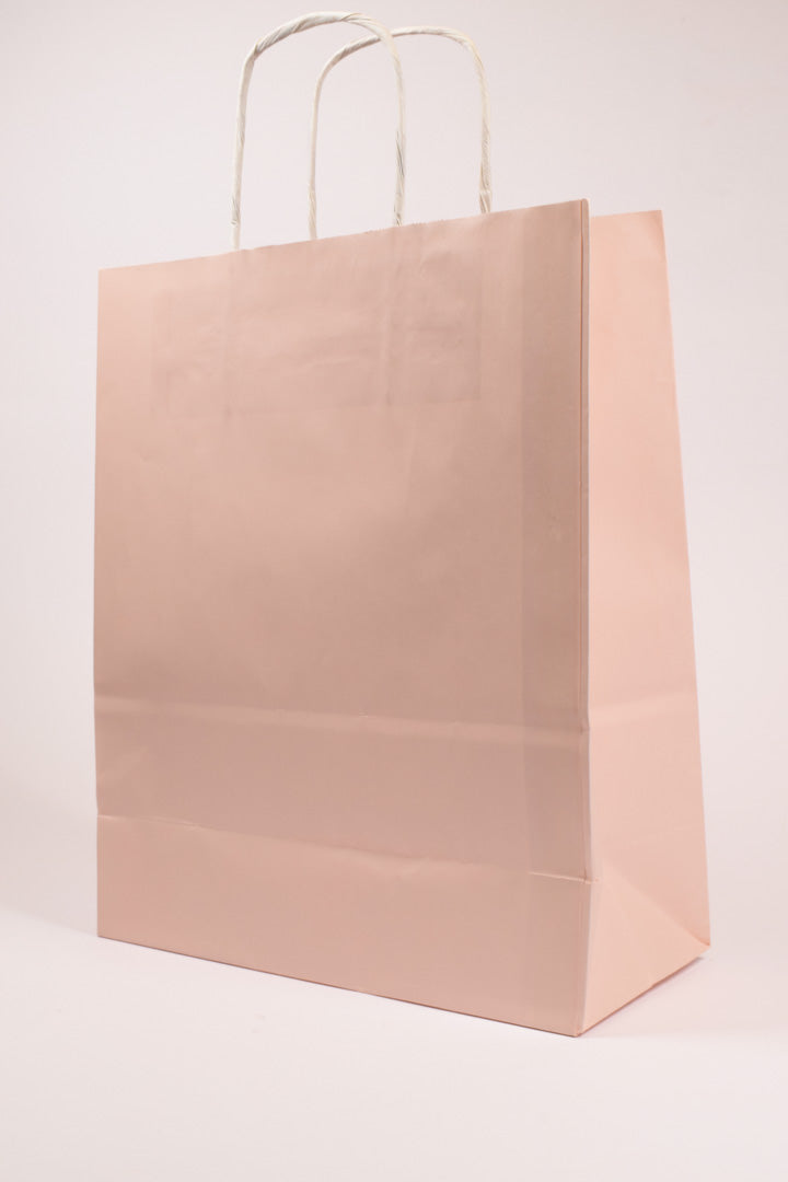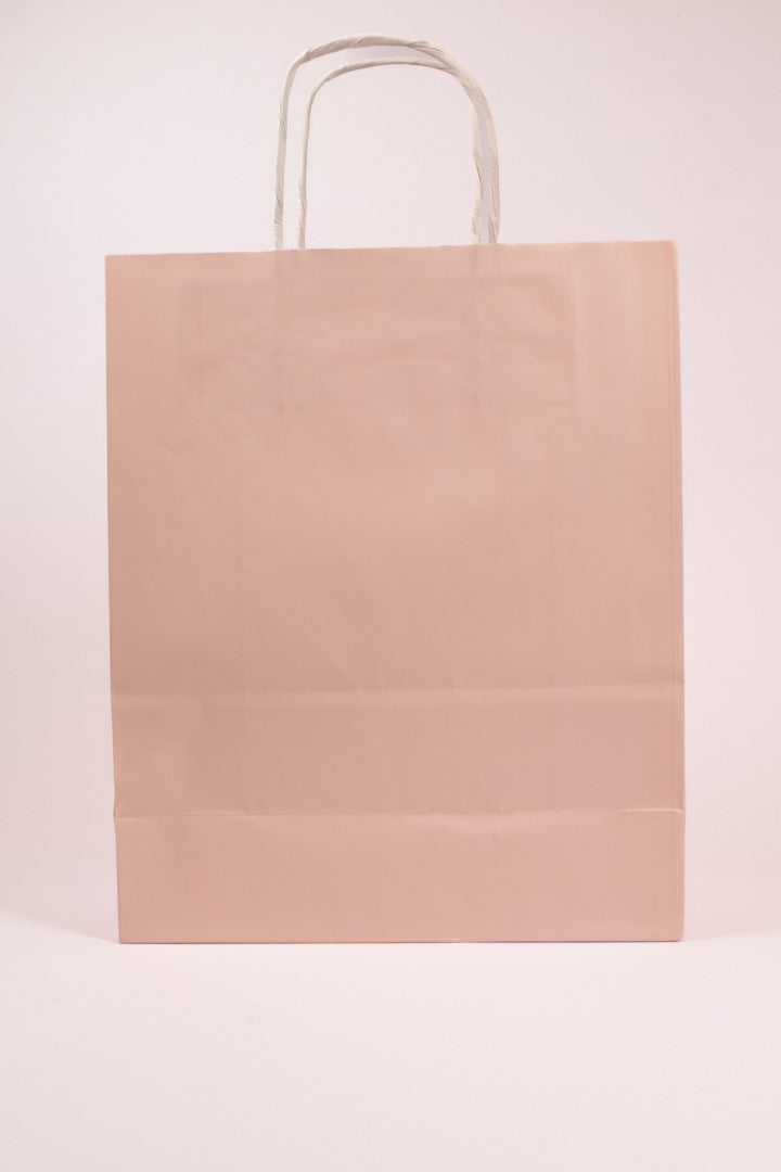 - Manici in carta ritorta bianca: extra resistenti e perfettamente coordinati con il rosa pastello, garantiscono comfort e sicurezza anche con contenuti pesanti