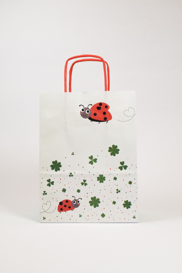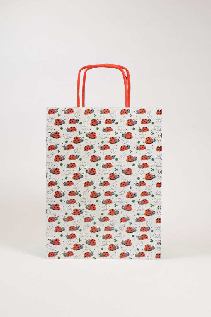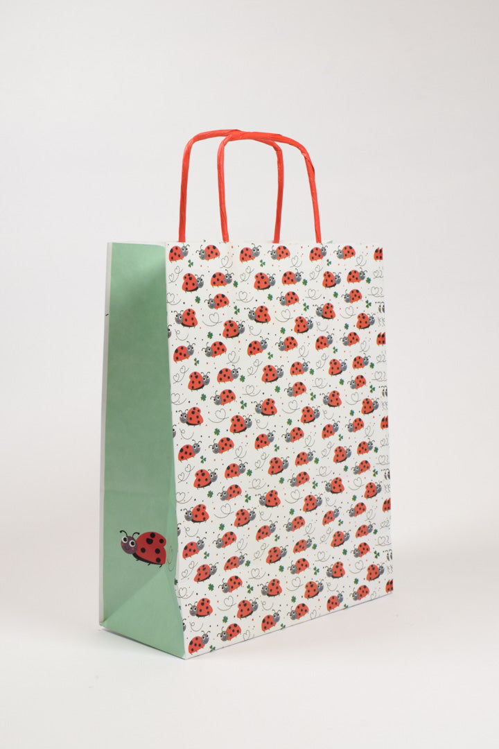 Un augurio speciale in ogni confezione. La borsa Coccinelle trasforma ogni regalo in un messaggio di buona fortuna grazie alla sua grafica che celebra i simboli più amati del buon auspicio. Le coccinelle sono illustrate con tratti simpatici e accattivanti nei classici toni del rosso e nero, con un'espressione sorridente che conquista a prima vista. Il design si arricchisce di quadrifogli verdi di diverse dimensioni e delicati cuoricini che tracciano il percorso di volo degli insetti portafortuna. La parte frontale presenta le coccinelle su sfondo bianco punteggiato da piccoli pois colorati, mentre il retro sfoggia un pattern all-over che crea un effetto avvolgente. I fianchi in verde menta con una singola coccinella nell'angolo e i manici rosso corallo completano la palette cromatica con eleganza.