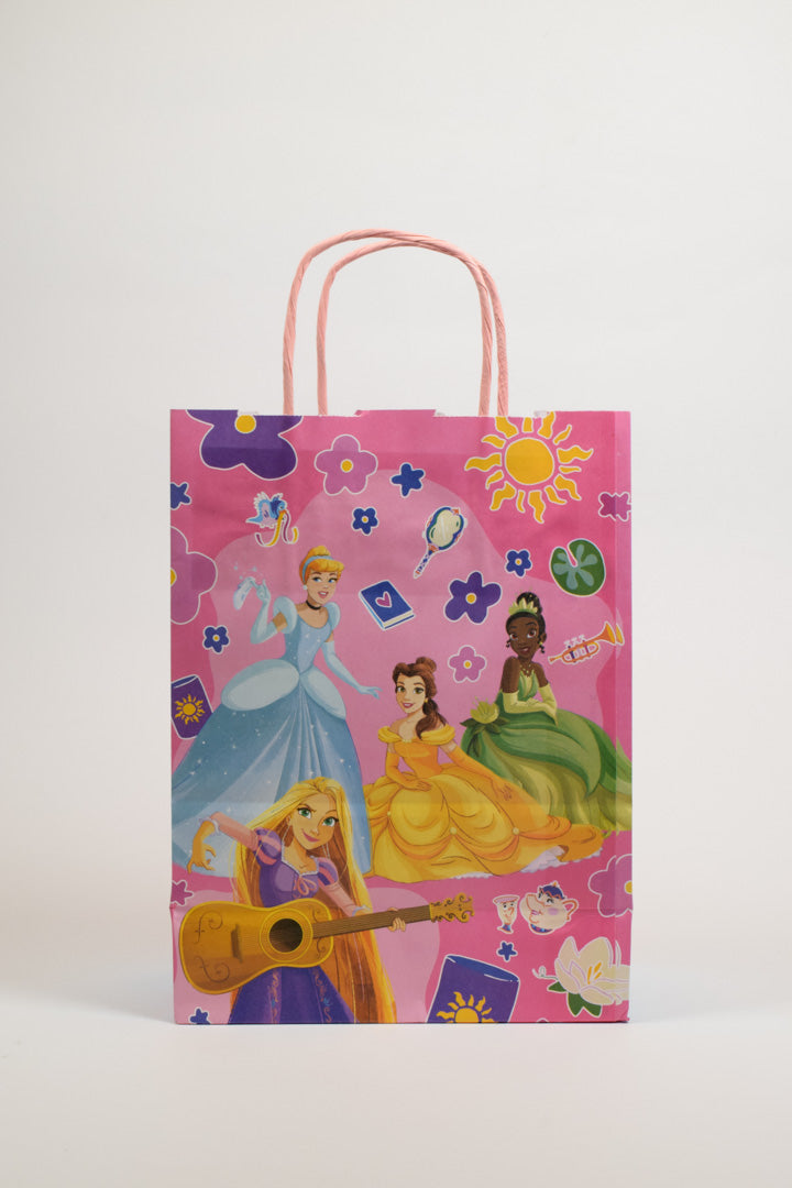 L'incanto Disney in un packaging da favola. Queste borse regalo portano la magia del mondo Disney Princess direttamente nelle mani delle piccole fan. Su uno sfondo sfumato dal rosa al fucsia, le principesse più iconiche prendono vita in scene ricche di dettagli: Rapunzel suona la chitarra con i suoi lunghissimi capelli dorati, Belle sfoggia il celebre abito giallo, Ariel emerge dalle onde accompagnata da Flounder e Sebastian, Jasmine volteggia sul tappeto magico, mentre Cenerentola e Tiana incantano con i loro abiti eleganti. Il lato della borsa presenta un delicato pattern azzurro con fiori colorati, soli stilizzati e il logo ufficiale Disney Princess, creando un packaging curato in ogni dettaglio che farà sentire speciale ogni bambina.