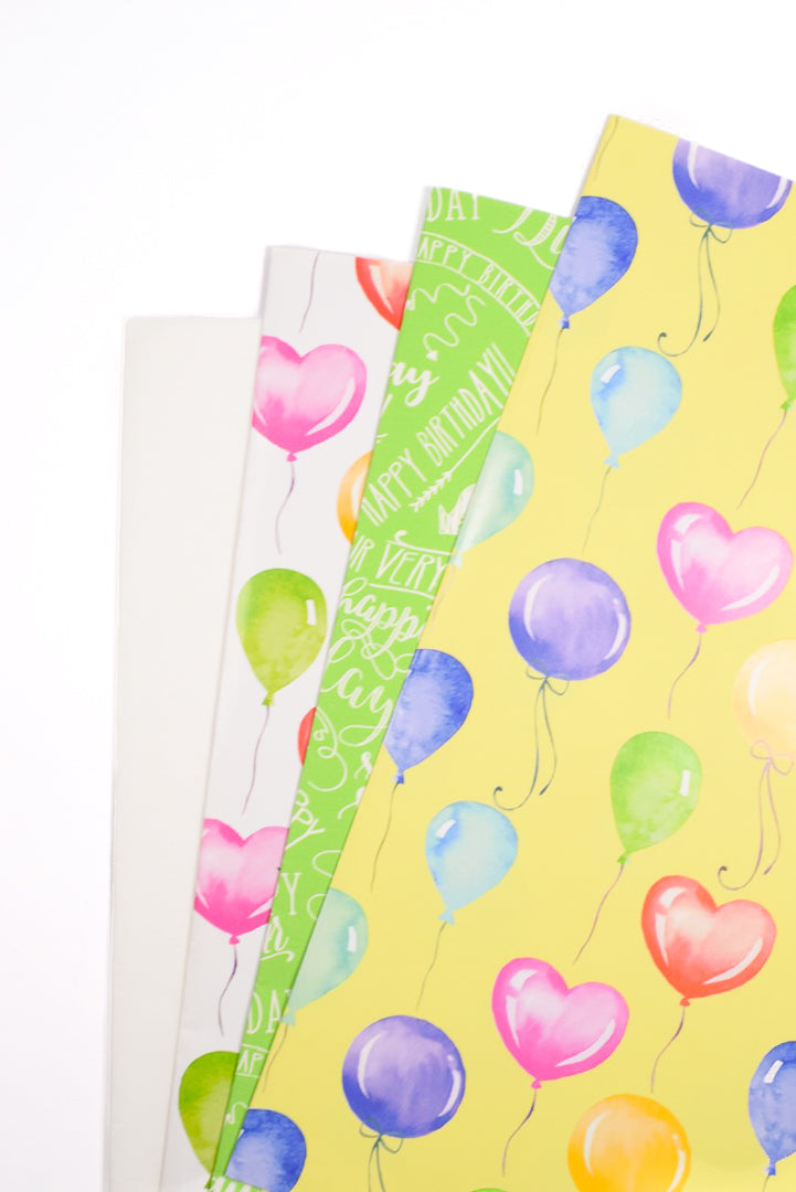 Il set è pensato per chi desidera avere sempre a disposizione la carta regalo perfetta per ogni compleanno, senza rinunciare alla varietà. Le quattro fantasie coordinate — palloncini su fondo bianco per un look fresco e pulito, palloncini su fondo giallo per un'atmosfera calda e solare, scritte augurali su fondo verde per un effetto più dinamico e tipografico — permettono di personalizzare il confezionamento in base al destinatario e all'occasione, dai compleanni dei più piccoli fino alle feste a sorpresa per gli adulti.