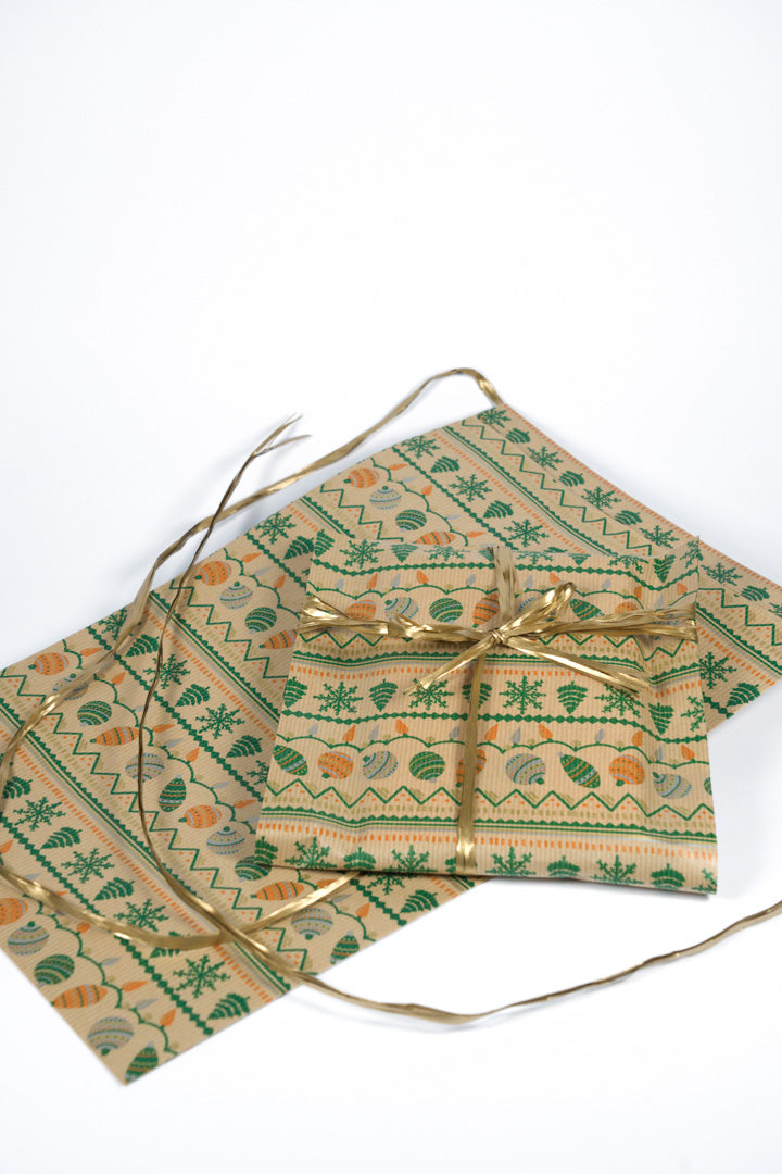 - Design scandinavo esclusivo: pattern geometrico con fiocchi di neve stilizzati, alberi minimalisti e guanti in verde foresta e arancione terracotta su base kraft naturale